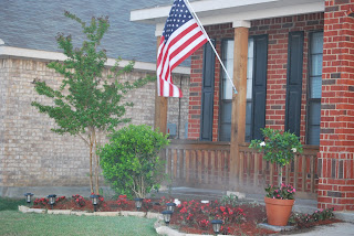 Today we did a some beautifying around our front yard. Jared loves doing the yard and I love watching him do the yard, so it works out! We put some flowers in the front bed and Jared potted my Mother's Day present, my gardenia tree! It smells heavenly and reminds me of being in Hawaii. I love it. Our nephews Caden and Toby came over today to help us plant. And our new flag was the perfect addition.